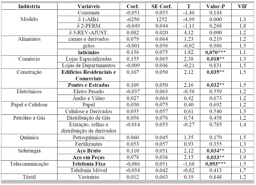 Conforme pode ser verificado pelos VIFs (variance inflaction factors), que se apresentaram abaixo de 5, não há problemas de multicolinearidade. Segundo Gujarati (2000) e Wooldridge (2006) se o VIF exceder 10, diz-se que esta variável é altamente colinear. Por meio da análise das estatísticas t e seus p-values, verifica-se que os Grupos “laticínios” do setor alimentício, “edifícios residenciais” e “pontes e estradas”, ambos do setor de construção, “papel e celulose” e “derivados”, ambos do setor de papel e celulose, “petroquímicos” do setor químico, “telefonia fixa” e “telefonia móvel”, ambos do setor de telecomunicações e “vestuário”, trazem poder explicativo ao modelo KS (1995).