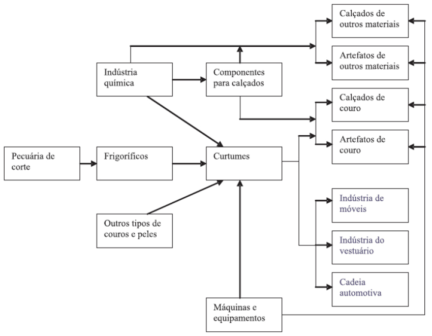 A indústria calçadista, conforme destacado por Schuh (2006), apresenta inter- relações com diversos setores industriais, destacando-se a indústria química e do vestuário, porém, seus segmentos mais importantes estão relacionados ao processamento do couro e à confecção do calçado. A cadeia coureiro-calçadista é descrita na Figura 1.