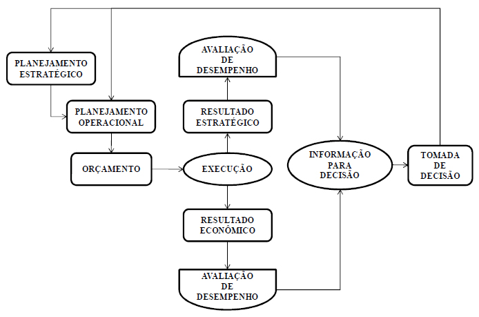 A avaliação de desempenho é o processo que permite à empresa uma análise comparativa entre os resultados planejados e os resultados efetivos. É comum, nesse processo, a utilização de padrões preestabelecidos, sejam eles de natureza financeira e/ou não-financeira. A Figura 2 ilustra como a avaliação de desempenho, no âmbito do processo de gestão, abastece a empresa com informações para a tomada de decisões.