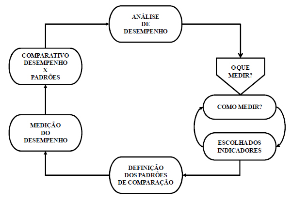 De modo geral, o processo de avaliação de desempenho enseja alguns pré- requisitos, tais como: (1) definição do que medir; (2) escolha do conjunto de indicadores para saber como medir; (3) desenvolvimento de padrões de comparação; (4) mensuração do conjunto de indicadores;(5) comparação dos dados coletados com os padrões pré- estabelecidos; (6) análise das informações para a tomada de decisão (PEREIRA, 1999; SCHNEIDER, 2003; MARTINS, 2004). A Figura 3 ilustra o processo de avaliação de desempenho.