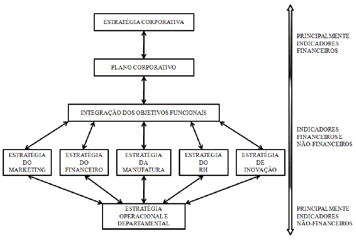 De acordo com a necessidade de avaliação de desempenho, podem ser utilizados indicadores financeiros e não-financeiros. Os indicadores financeiros têm sua origem na contabilidade financeira e nos seus sistemas auxiliares, além dos sistemas de custos. Esses indicadores apresentam informações calculadas a partir de dados históricos, utilizados como referência. Por se tratar de dados passados, Berton (2003) ressalva que estes indicadores devem ser utilizados em conjunto com outros. Os indicadores não-financeiros, segundo Miranda e Azevedo (2000), independem da contabilidade da empresa e se referem, por exemplo, aos clientes, à participação de mercado, aos funcionários, entre outros. Martin (1997) descreve que esses indicadores focam os objetivos estratégicos da empresa do menor ao maior nível organizacional. A Figura 4 apresenta as diferentes necessidades de indicadores de cada nível.