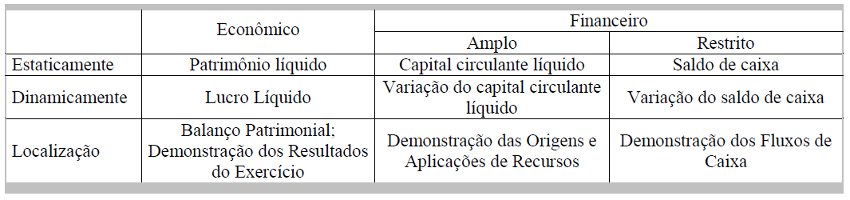Além desse raciocínio científico, Matarazzo (2003) apresenta uma distinção entre os conceitos de resultado econômico e resultado financeiro. De acordo com o autor, o resultado econômico diz respeito ao lucro ou prejuízo e aumenta ou reduz o patrimônio líquido, mas não necessariamente altera as disponibilidades de dinheiro. No sentido dinâmico, o resultado econômico se refere à formação do lucro líquido e, no sentido estático, se refere ao patrimônio líquido. Já o resultado financeiro refere-se às disponibilidades, representando, de forma dinâmica, a variação do saldo de caixa e, de forma estática, o saldo de caixa. Enquanto no sentido amplo o resultado financeiro refere- se ao capital circulante líquido, no sentido restrito refere-se ao caixa propriamente dito (Quadro 1).