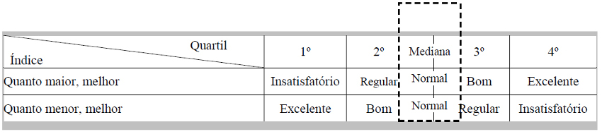 Dos dados representativos de cada elemento do conjunto de indicadores, foram extraídos os valores da mediana (número central) e dos quartis.
