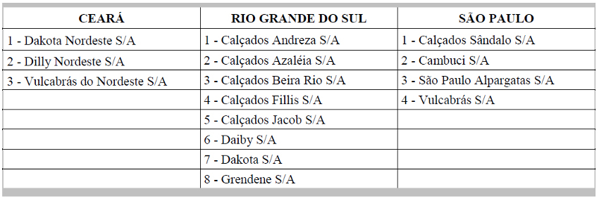 Utilizando a amostragem por tipicidade ou intencional, foram selecionadas 15 empresas, identificadas como empresas que publicaram as demonstrações contábeis durante todo o período de 2000 a 2006. Essa amostra (Quadro 3) destaca-se por sua importância no setor. De fato, em 2006, o faturamento bruto deste grupo de indústrias resultou no montante de R$ 5,14 bilhões, representando, aproximadamente, 26% do faturamento anual do setor, estimado, conforme Caetano (2008), em R$ 20 bilhões. Compõe a amostra cinco empresas de capital aberto - Azaléia, Cambuci, Grendene, Alpargatas e Vulcabrás - listadas na Bolsa de Valores de São Paulo (BOVESPA), reforçando a sua representatividade.
