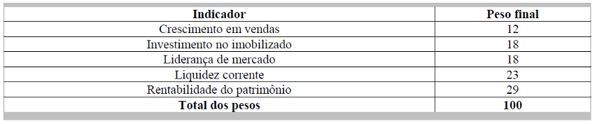 Elaborou-se, também, o ranking das empresas, partindo-se da metodologia adotada pela revista Melhores e Maiores (EXAME, 2007), a qual utiliza 6 indicadores econômico- financeiros para compor o índice excelência empresarial. Para os fins desse estudo, o indicador riqueza gerada por empregado foi eliminado da composição do índice, pois não há, nas demonstrações contábeis publicadas, informações sobre o número de empregados. A Tabela 1 apresenta os indicadores e respectivos pesos utilizados.