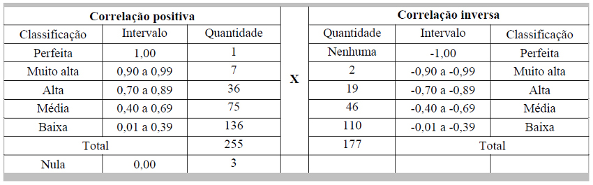 Análise de correlação foi aplicada aos índices-padrão dos indicadores, com exceção do índice de excelência empresarial, destinado ao ranking das empresas, mais o índice de previsão de insolvência. Os resultados da análise, num total de 435 coeficientes, apontam para 58,6% de correlações positivas, 40,7% de correlações inversas e 0,7% de correlações nulas, conforme revelado no Quadro 5. Verifica-se também que as correlações positivas e inversas classificadas como baixas ou médias representam 57,5% dos coeficientes (Quadro 5).