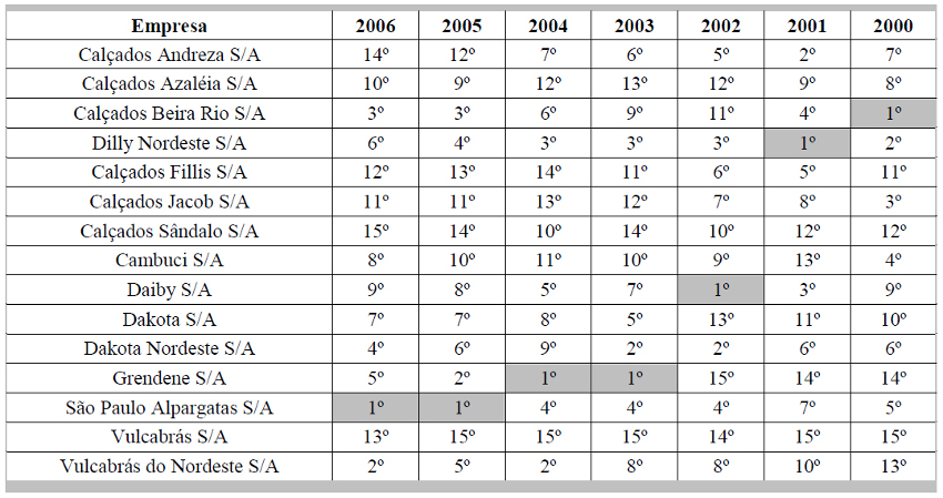 Há também, por outro lado, um movimento inverso dessas empresas ao longo do período de 2000 a 2006. A São Paulo Alpargatas melhorou seu posicionamento, encerrando o ano de 2006 como a líder do ranking, cujo resultado é confirmado pela publicação Exame (2007); enquanto isso, a Dilly Nordeste decresceu, encerrando o ano em 6° lugar.