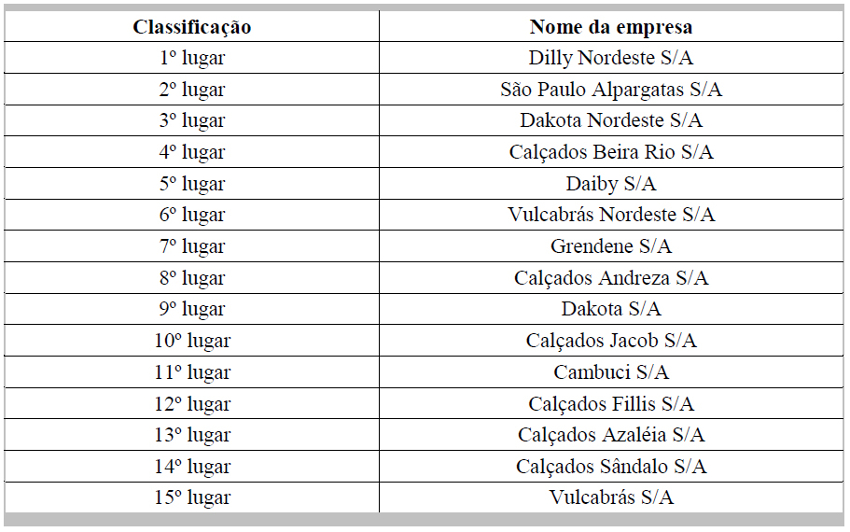Na Tabela 3 é apresentada a classificação geral das empresas no período examinado, tendo a empresa Dilly Nordeste conquistado o 1° lugar, a São Paulo Alpargatas o 2°, e assim sucessivamente, até a última colocada Vulcabrás.