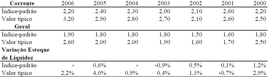 estabilidade da liquidez corrente (R$2,2) e liquidez geral (de R$1,8 para R$1,9) e redução na variação do estoque de liquidez (de 1,2% para 0%). Verifica-se, assim, que os indicadores de liquidez permaneceram praticamente inalterados, e que os índices de variação no estoque de disponibilidades pressupõem que não houve restrições ao crédito em algum período;