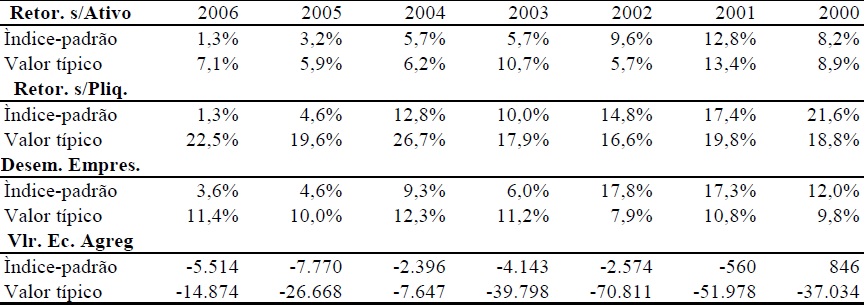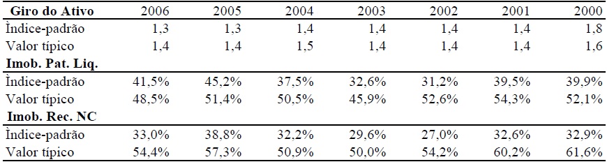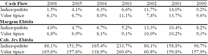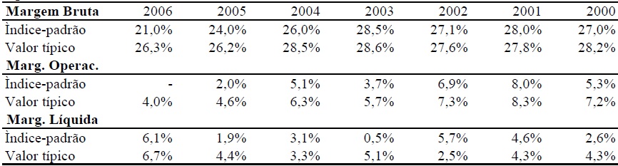 Os resultados da análise dos índices-padrão apontam que durante o período de 2000 a 2006 houve estabilidade nos índices de liquidez e melhora nos índices de solvência. A atividade operacional apresentou redução nas vendas, que, acompanhada de uma redução não proporcional dos custos e despesas operacionais, provavelmente em função dos custos fixos, refletiu na queda da lucratividade e rentabilidade. Essa queda foi acompanhada também pela redução do capital de giro e da capacidade de cobertura dos juros e despesas financeiras. Além disso, houve aumento nos prazos médios de estocagem e recebimento.