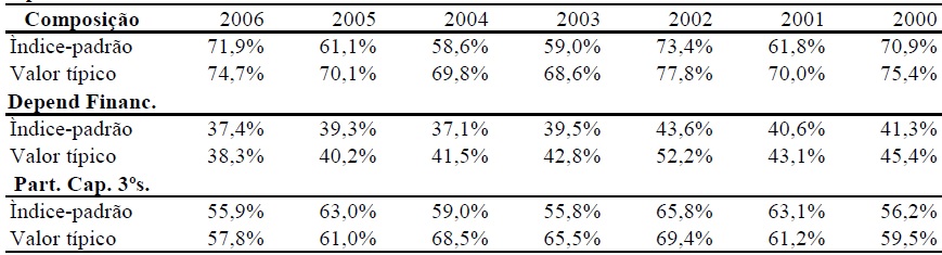 Observa-se, ainda, pela análise do índice-padrão, do ano 2006 em relação ao ano de 2000, que a relação entre liquidez, rentabilidade e endividamento em parte confirma a teoria, pois a manutenção dos indicadores de liquidez esteve associada à redução da dependência de recursos de terceiros e da rentabilidade em 46% da amostra. Das empresas analisadas, 33% apresentam aumento de liquidez, redução da margem operacional e redução da dependência financeira; 13% apresentam redução da liquidez e aumento da margem operacional e da dependência financeira; as demais empresas apresentaram situações diferenciadas.