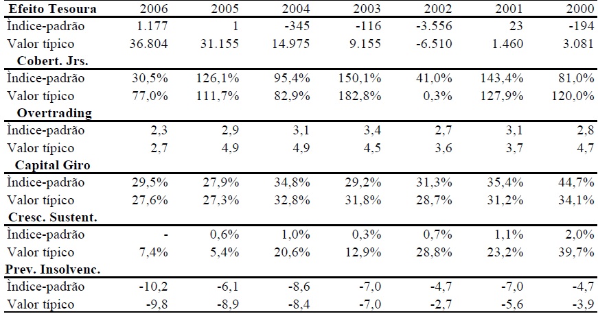 redução do coeficiente de overtrading (de 2,8 para 2,3), capital de giro (de 44,7% para 29,5%), previsão de insolvência (de -4,7 para -10,2) e taxa de crescimento sustentável (de 2% para 0%), índice de cobertura de juros (de 81% para 30,5%) e aumento do indicador do efeito tesoura (de $ -194 para $1.177), ou seja, houve melhora em relação a solvência das empresas (coeficiente de overtrading, previsão de insolvência, efeito tesoura) ao mesmo tempo em que houve queda no capital de giro e na taxa de crescimento pela retenção de recursos próprios.