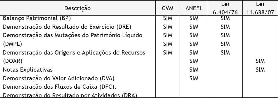 A DFC e a DVA também estão previstas no manual de contabilidade instituído pela Agência Nacional de Energia Elétrica (ANEEL). Além dessas duas demonstrações, a ANEEL, por meio da Resolução nº 444/01, exige a elaboração da Demonstração do Resultado por Atividades (DRA), em complemento às demais demonstrações exigidas pela lei societária.