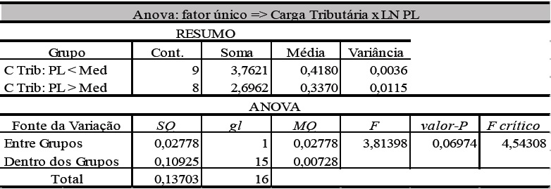 Comparando as médias das cargas tributárias, observa-se que a carga tributária média das 9 empresas com menor valor de PL é 8,1 pontos percentuais maior que a carga tributária das que possuem PL maior que a média da amostra (0,4180 x 0,3370). Contudo, observando o “F” estatístico calculado em 3,81398, percebe-se que este é um pouco menor que o “F crítico”, situado 4,54308, o que leva a concluir que as médias de carga tributária das empresas não podem ser consideradas estatisticamente diferentes nos dois grupos analisados, num intervalo de confiança de 95%. Pelo “valor-P”, pode-se concluir que a probabilidade de que as médias das cargas tributárias dos dois grupos de empresas sejam iguais, está próxima a 6,97% (0,06974), o que revela que as médias são diferentes quando se diminui o intervalo de confiança para 90%.