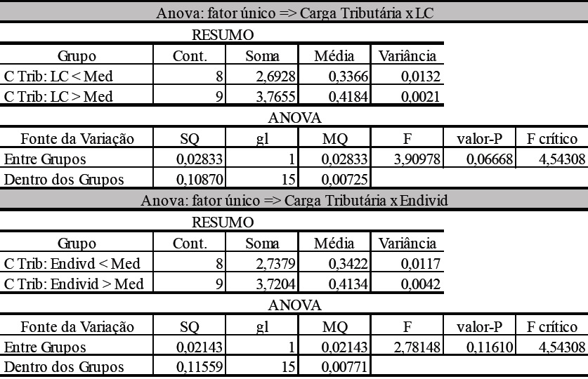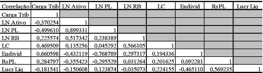 Verifica-se pelos dados da Tabela 2 que a variável que possui maior grau de correlação com a carga tributária evidenciada é o Endividamento (Endivid.: 0,660598). Apesar de não apresentar a mesma significância, outras variáveis também têm correlação próxima a 50%, como é o caso do LN PL e da LC. Mesmo assim, para a análise de variância não se pode descartar outros níveis de correlação, o que conduz à opção de analisar em cada grupo de variáveis aquelas com maior correlação.