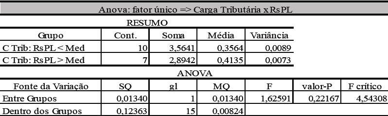 Outro fator que poderia explicar as diferenças entre a carga tributária das empresas da amostra, seria a relação com o indicador de Retorno sobre o Patrimônio Líquido (RsPL). A média de RsPL das empresas, conforme a estatística descritiva (Tabela 1, seção 4.2), é de 0,23506. Conforme dados da Tabela 6, as 10 empresas têm um RsPL inferior a esta média, evidenciaram uma carga tributária média de 0,3564 (35,64%), enquanto que as demais 7 empresas, com rentabilidade maior que a média, evidenciaram carga tributária média de 41,35% (0,4135) em relação à receita Bruta. Contudo, esta diferença não é estatisticamente significativa, o que fica comprovado pelos cálculos de Anova, nos quais o “F” calculado (1,62591) é bem inferior ao “F Crítico” (4,54308).