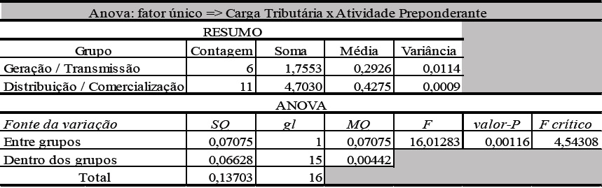 Percebe-se uma carga tributária muito menor nas empresas de geração e transmissão, situação que se confirma estatisticamente pela análise de variância, na qual o “F” calculado é de 16,01283 enquanto que o “F crítico” é bem inferior, situado em 4,54308. Isso serve para afirmar que as médias de carga tributária evidenciada são mesmo diferentes, num nível de significância de 99%, o que pode ser comprovado pelo Valor-P de 0,00116 (0,116%).