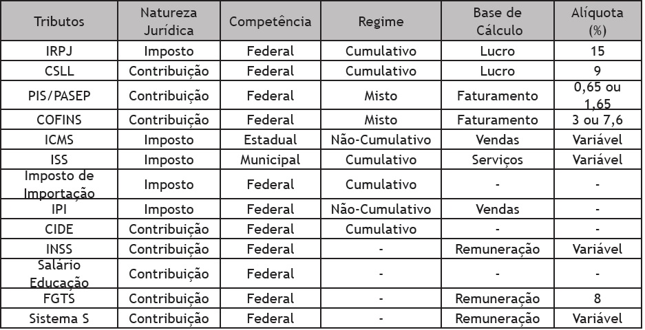 existência de cerca de 60 tributos cobrados no Brasil, entre impostos, taxas e contribuições;