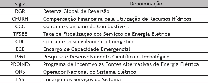 Estes encargos setoriais, juntamente com os tributos apresentados no Quadro 2, formam a carga tributária incidente sobre as atividades do setor de energia elétrica.