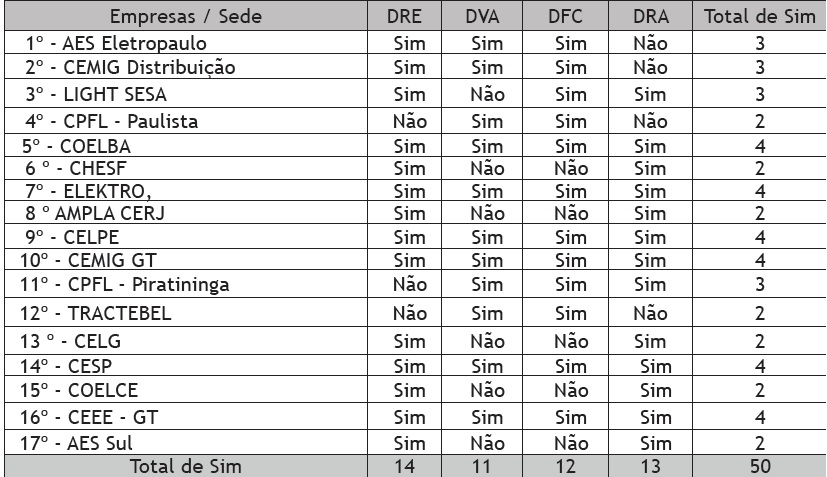 Considerando a obrigatoriedade de evidenciação adicional destas três demonstrações, verifica-se que, das 17 empresas, somente 6 cumpriram integralmente esta exigência da ANEEL, enquanto que as demais 11 companhias (64,7%) não obedeceram à exigência normativa.