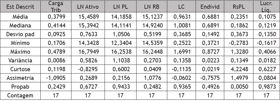 Com o intuito de identificar uma possível relação entre a carga tributária evidenciada pelas empresas e as variáveis selecionadas, apresentam-se, primeiramente, os dados relativos à estatística descritiva das varáveis analisadas, conforme Tabela 1.