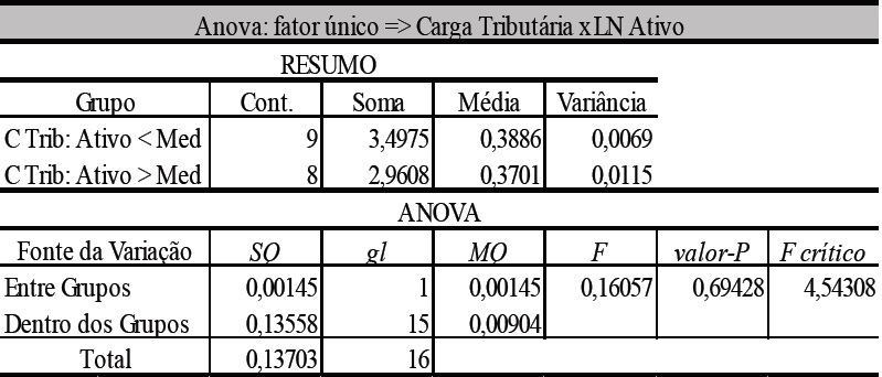 Exemplificando, considera-se o ordenamento da carga tributária segundo a variável LN Ativo, ou seja, as empresas da amostra são divididas em dois grupos: um grupo com LN Ativo menor que a média da amostra e outro grupo com LN Ativo maior que essa média. A partir desta classificação, procede-se a identificação da carga tributária média de cada grupo de empresas e, por meio de análise de variância (ANOVA), segundo expressa Lapponi (2005), determina-se se as médias destes dois grupos são iguais ou se podem ser consideradas diferentes.