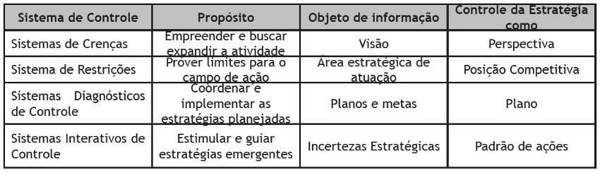 O Quadro 1 resume os quatro tipos de sistema de controle proposto por Simons e reproduzido em uma obra que consolidou o construto (SIMONS, 2000).