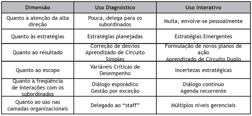Henri (2006) defende a complementaridade do Uso Diagnóstico com o Uso Interativo, pois o resultado do seu trabalho mostrou que o Uso Diagnóstico exerce pressão negativa sobre as capacidades (orientação para mercado, empreendedorismo, inovação e aprendizado organizacional), enquanto o Uso Interativo favorece as capacidades de orientação para mercado, empreendedorismo, inovação e aprendizagem organizacional. A inovação do estudo está na introdução do construto Tensões Dinâmicas, mostrando que este construto, influenciado pelo Uso Diagnóstico e Uso Interativo, produz efeitos positivos no desenvolvimento das competências, habilitando o SCG como um recurso valioso, distintivo e imperfeitamente imitável dentro da ótica Visão Baseada em Recursos (BARNEY, 2007).