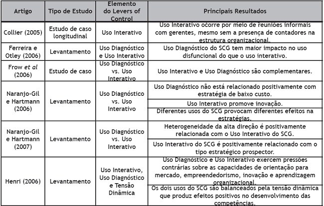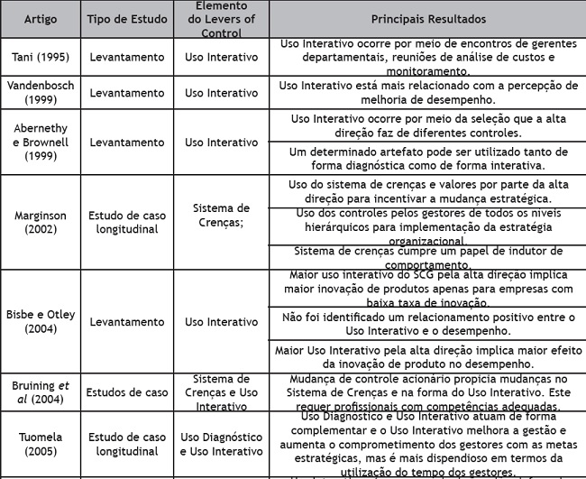 Foram analisados os trabalhos que utilizaram, mesmo que parcialmente, o modelo Levers of Control de Simons. Para isso fez-se uma busca, cujo término se deu em janeiro de 2008, em três dos principais periódicos de Contabilidade Gerencial (Accounting, Organizations and Society, Journal of Management Accounting r esearch, Management Accounting r esearch) os quais estão presentes nesse tipo de pesquisa bibliográfica, no principal periódico de Estratégia (Strategic Management Journal). Fez-se também uma pesquisa no SSRN com as seguintes palavras-chave: levers of control, simons, interactive control, management control and strategy. O método de análise utilizado foi ler primeiramente o resumo para confirmar se pelo menos partes do modelo foram abordadas, e em caso positivo, os trabalhos foram lidos integralmente. Porém, muitos trabalhos tinham outros objetivos concomitantes e, nesses casos, a conclusão relatada no presente trabalho limitou-se ao modelo Levers of Control. A seguir são relacionados 16 trabalhos, em ordem cronológica, destacando-se o tipo de estudo, a validação do modelo teórico e os principais resultados.