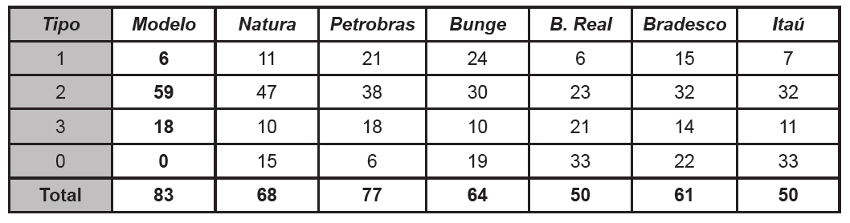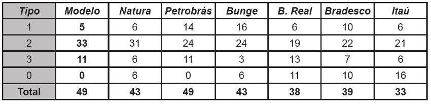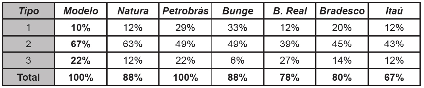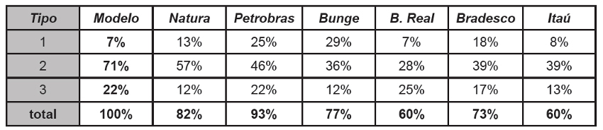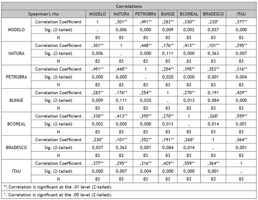 De acordo com o teste, a correlação entre o modelo ideal e as empresas seria perfeita se o resultado da correlação obtivesse valores mais próximos de 1,00. Como pode ser observado na primeira coluna nomeada “Modelo”, têm-se o relatório modelo e observa- se que o nível de significância entre Modelo x Modelo é perfeito, pois são iguais. Nas outras linhas vão sendo apresentadas todas as empresas, comparadas ao modelo.