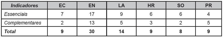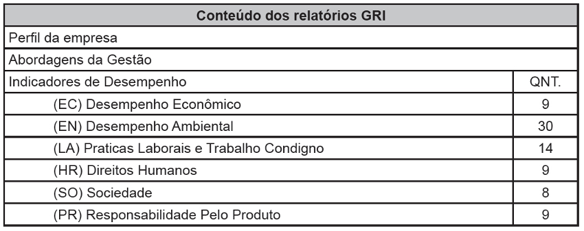 Na tabela a seguir está demonstrada a quantidade de indicadores essenciais e complementares que são abrangidos nas diretrizes GRI para relatórios de sustentabilidade: