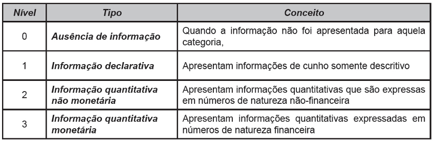 Os níveis de evidenciação utilizados para este estudo, foram embasados nas pesquisas de Gray et al. (1995) apud Nossa e Carvalho (2003), de Hackston e Milne, (1996) apud Nossa e Carvalho (2003), de Salamone e Galluccio (2001) apud Nossa e Carvalho (2003). Assim, os níveis de evidenciação são demonstrados na tabela abaixo: