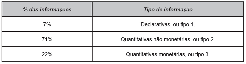 Para traçar um parâmetro de comparações entre os relatórios foi estabelecido um modelo padrão de evidenciação das informações a fim de definir qual seria a quantidade ideal de informações para um relatório de sustentabilidade no modelo GRI. Esse padrão foi estabelecido de acordo com o nível de exigências de informação pedida pelo próprio indicador GRI, ou seja, para cada indicador GRI observa-se se o nível de informação ideal seria: de tipo 1 (declarativa), tipo 2 (quantitativa não monetária) ou tipo 3 (quantitativa monetária).