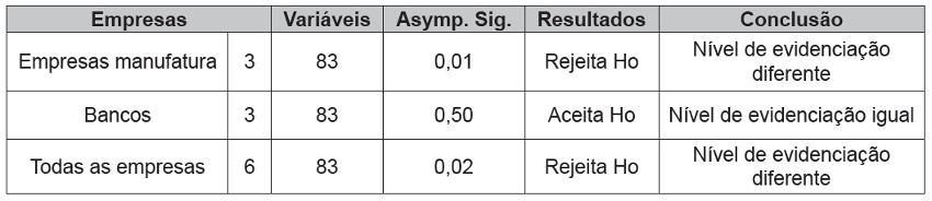Na primeira análise entre as empresas de manufatura (Natura, Petrobras e Bunge) o resultado sugeriu a rejeição de H0 denotando que a evidenciação das informações contidas nos relatórios de sustentabilidade de cada uma das empresas é diferente. A análise feita entre os bancos sugeriu a aceitação de H0 supondo que a evidenciação entre as empresas está dentro da mesma média, ou seja, pelo total de observações as empresas apresentam um mesmo nível de evidenciação das informações.