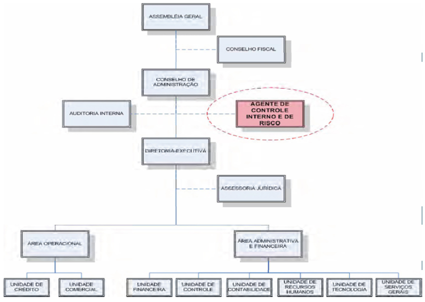 No caso das cooperativas singulares que compõem o sistema SICOOB, o controle do risco operacional, bem como dos demais riscos que permeiam a atividade de intermediação financeira, está incluído em sua estrutura organizacional, em que o sistema cria e propõe para suas filiadas a existência de um agente de controle de riscos, descrito na estrutura proposta a seguir.