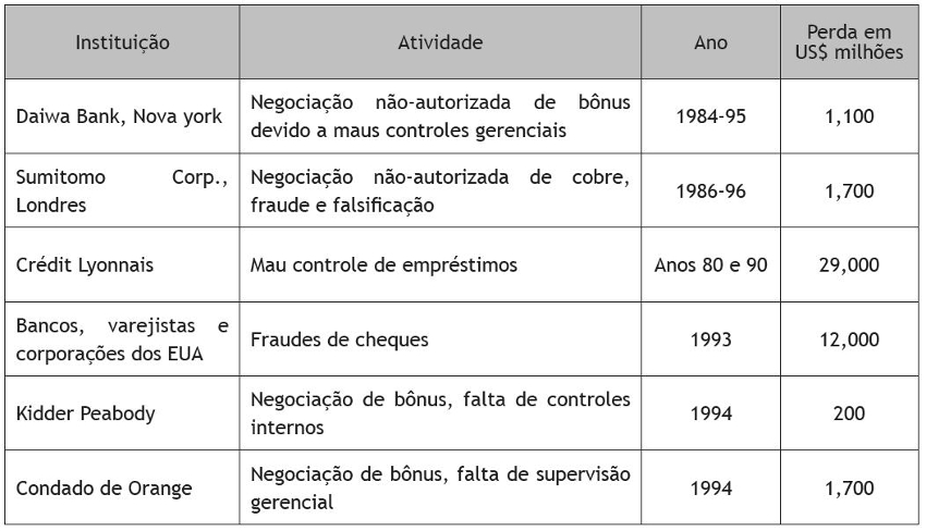 Talvez os exemplos sejam a forma mais clara de visualizar e identificar riscos operacionais e os efeitos da sua ocorrência. Marshall (2002), ao citar pesquisa realizada pela Operational Risk, Inc., enfatizou que, desde 1980, instituições financeiras têm perdido mais de US$ 200 bilhões devido a riscos operacionais. O Quadro 1 apresenta exemplos mais conhecidos de risco operacional.