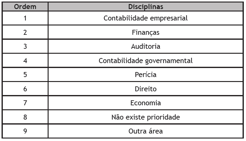 Inicialmente, a ordem apresentada no questionário foi, do número 01 ao 09: Finanças, Auditoria, direito, economia, Contabilidade Governamental, Contabilidade empresarial, Perícia, outra(s) e Não existe prioridade. Conforme Tabela 1, após aplicação do questionário, a seqüência ficou a seguinte: Contabilidade empresarial, Finanças, Auditoria, Contabilidade Governamental, Perícia, direito, economia, Não existe prioridade e outra(s).