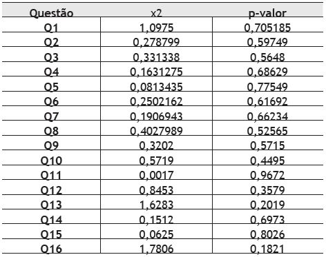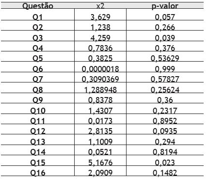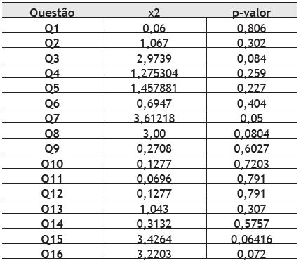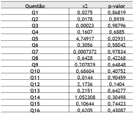 A análise foi realizada pelo cruzamento entre o gênero e as questões de 1 a 16. A Tabela 1 evidencia o x2e o p-valor obtidos por meio do cruzamento entre a alternativa escolhida e o gênero dos estudantes A e B.