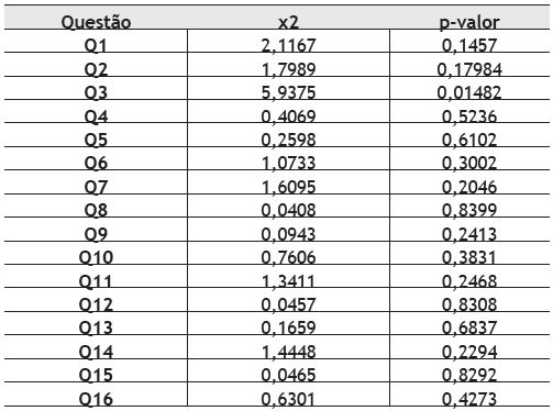 Observa-se que, em relação aos estudantes, as questões 1, 2, 4, 5, 6, 7, 8, 9, 10, 11, 12, 13, 14 e 16 apresentam um p-valor acima de 0,05. Conclui-se, portanto, com 95% de confiança pela aceitação de H0 e rejeição de H1. Isto significa dizer que o gênero não influencia no comportamento A e B para estas questões.
