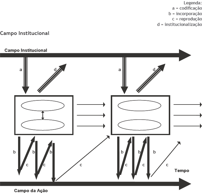 O comportamento repetitivo dos atores provoca a repetição de regras e rotinas e finalmente essas rotinas e regras se tornam institucionalizadas, constituindo novos elementos do campo institucional.