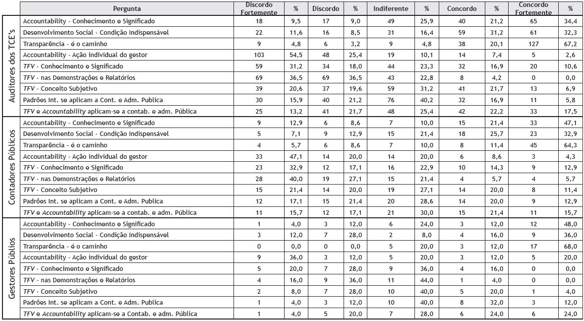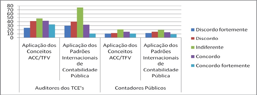 Considerando que esse resultado levou a conclusões com a percepção desses dois grupos envolvidos no processo: quando estão segregados em função do seu conhecimento de accountability, os auditores públicos acreditam que são aplicáveis à contabilidade pública brasileira os padrões internacionais de contabilidade e os conceitos/doutrinas accountability e true and fair view, já os contadores públicos divergem apenas no que tange à aplicação dos padrões, pois eles não acreditam neles.