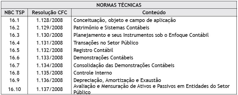 No dia 21 de novembro de 2008, foram aprovadas em plenária do Conselho Federal de Contabilidade as NBCASP, sedimentando definitivamente a migração do foco no orçamento para patrimônio pela contabilidade pública brasileira. Vê-se neste fato uma decisão de aproximação com a ciência contábil, passando todos os fatos administrativos, que antes eram examinados e registrados por terem origem no orçamento, a serem examinados e registrados por produzirem alterações em algum elemento patrimonial. Essa proposição já constava regulamentada no diploma legal desde 1964, pela Lei nº 4.320, e agora será necessário um estudo aprofundado dos artigos que tratam do processo de evidenciação contábil, em especial daqueles a partir do art. 83 (SILVA, 2008a). As NBC TSP aprovadas são as seguintes: