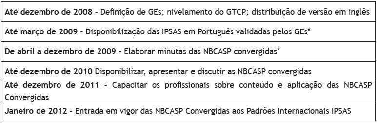 Tais documentos, além de anunciar uma série de mudanças conceituais, visam promover maior aproximação entre a ciência contábil e a contabilidade pública. Com vistas a convergir as NBC TSP às IPSAS, foi elaborado e aprovado um calendário de ações e metas do GTCP, que é apresentado abaixo: