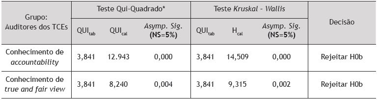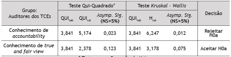 A primeira decisão é de rejeitar H0a, na ótica dos auditores dos TCEs, ou seja, os padrões internacionais de contabilidade são aplicados à contabilidade pública brasileira. Esta decisão se deu em virtude dos testes de Qui-Quadrado e Kruskal-Wallis calculados terem apresentado valores maiores do que os tabelados, fato esse que, em consonância com a teoria estatística, enseja a rejeição da hipótese nula, conforme aponta Hackbarth Neto e Stein (2003, p. 6) “[...] comparar o valor real com o valor teórico do teste. Se Qui calculado for menor que Qui tabelado não se pode rejeitar a hipótese nula.”