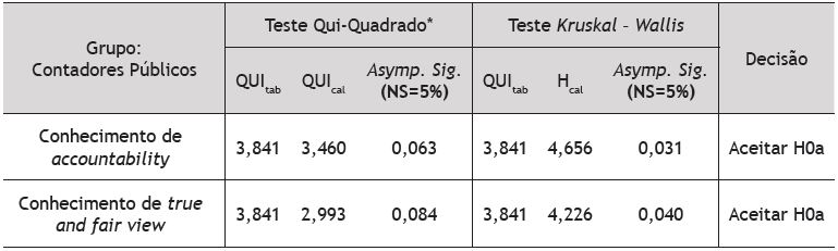 Os resultados encontrados orientaram para a construção de uma tabela com vistas a facilitar e melhorar a exposição e posterior decisão. Contatou-se que, para aqueles que conhecem o conceito/doutrina accountability, a aplicação dos dois conceitos/doutrinas true and fair view (visão verdadeira e apropriada) e accountability são a contabilidade e gestão pública brasileira, é sim possível, já que, de acordo com a teoria estatística, a decisão foi de rejeitar H0b, pressupondo que são aplicáveis. Já para aqueles que conhecem o true and fair view, a decisão estatística foi a de aceitar a hipótese nula, fato que destoa do que foi referenciado pelos dados descritivos, ou seja, 32,9% discordam, enquanto 30% são indiferentes e 37,1% se mostraram favoráveis, sinalizando que tais conceitos são aplicáveis.