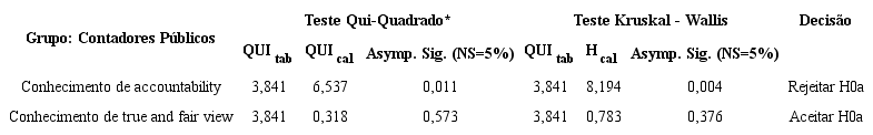 Aplicou-se ainda o teste de Kruskal-Wallis, pelo qual se obtiveram as respostas abaixo, onde para o Crosstabulation Accountability - Conheço este termo e sei o que significa * Estes conceitos true and fair view (visão verdadeira e apropriada) e accountability são aplicáveis na contabilidade e gestão pública brasileira, foram validados 44 (quarenta e quatro) questionários, enquanto no Crosstabulation True and Fair View (Visão Verdadeira e Apropriada) - Conheço este termo e sei o que significa * Estes conceitos true and fair view (visão verdadeira e apropriada) e accountability são aplicáveis na contabilidade e gestão pública brasileira, validou-se 40 (quarenta) questionários, fato que foi também verificado quando do teste do Qui-Quadrado.