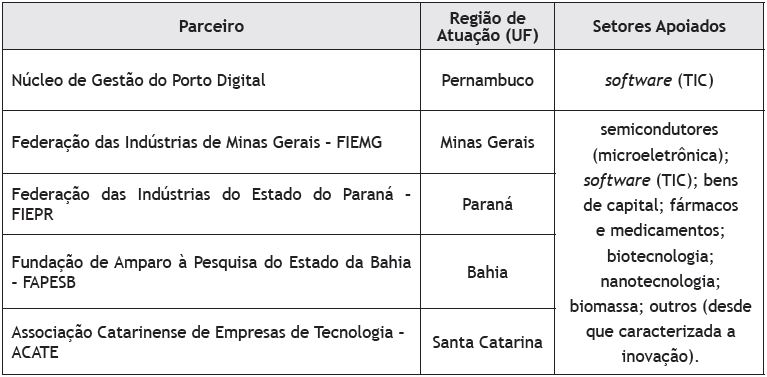 Como o objetivo do PJZ é financiar projetos inovadores das MPEs, para classificação do porte das empresas é utilizada a Portaria n˚ 176/2002 do Ministério do Desenvolvimento, Indústria e Comércio Exterior, conforme definição apresentada no item 2.1. Para implementação inicial (1ª fase) do PJZ, a FINEP lançou a Chamada Pública MCT/FINEP - Programa Juro Zero, em janeiro de 2004, com o objetivo de selecionar cinco instituições ou consórcios de instituições para serem seus parceiros estratégicos na implementação do programa em determinadas regiões do país, conforme destaca o Quadro 1.