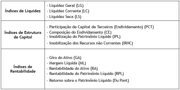 Os indicadores econômico-financeiros propostos por Matarazzo (2007), que utilizam como principal fonte de informação os demonstrativos contábeis, são divididos em três grupos: Liquidez, Estrutura de Capital e Rentabilidade, conforme apresenta o Quadro 2.