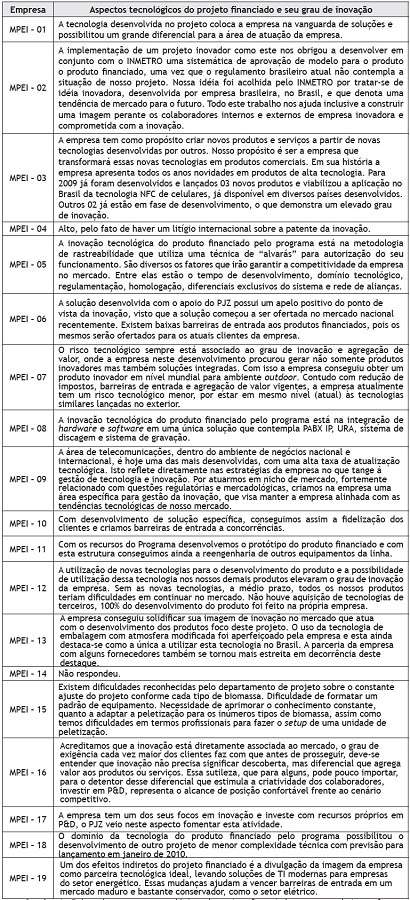 Na sequência, apresenta-se a descrição da inovação gerada nas MPEIs com o projeto financiado pelo PJZ. Torna-se importante ressaltar que os resultados apresentados nas seções seguintes dizem respeito às 22 empresas que finalizaram os projetos financiados até outubro de 2009 (período de realização da pesquisa) e que concordaram em participar da pesquisa.