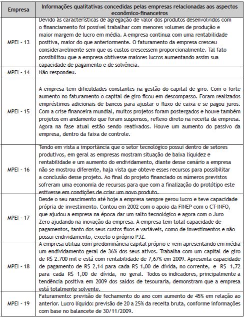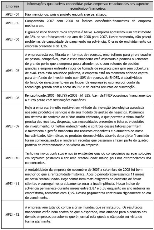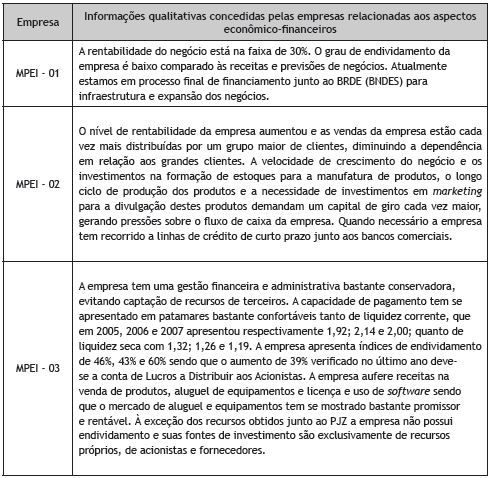 Com o intuito de complementar a análise quantitativa apresentada o Quadro 5 revela algumas informações qualitativas concedidas pelas empresas relacionadas aos respectivos aspectos econômico-financeiros.